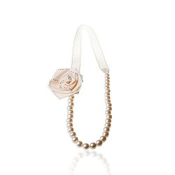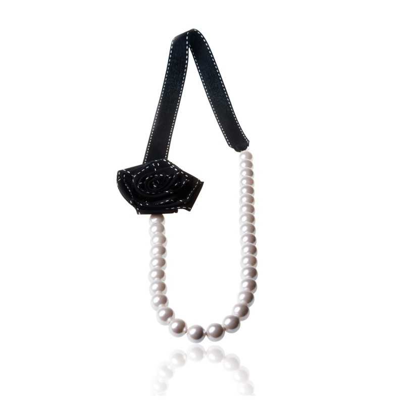 De rest van de ketting is gemaakt van een zachte witte of zwarte stof (naar wens). Deze stof heeft witte of zwarte stiksels, wat contrasteert met de rest van het juweel en het een heel bijzonder cachet geeft. We zullen ook de aanwezigheid van een grote bloem aan de linkerkant van de ketting opmerken. Het doorbreekt de overdreven strikte en klassieke uitstraling van de lange ketting.