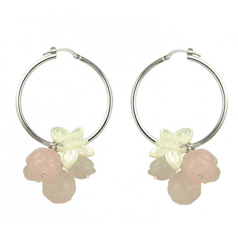 Dit paar roze Creoolse oorbellen is een elegant en verfijnd paar. Dit zijn lichtgewicht, modieuze en modieuze oorbellen om te dragen zonder matiging. Ze passen bij elk type outfit. Deze massief zilveren creolen met een bos bloemen, ballen in roze kwarts en parelmoervlinders zullen het hart van de vrouw charmeren die je bent.